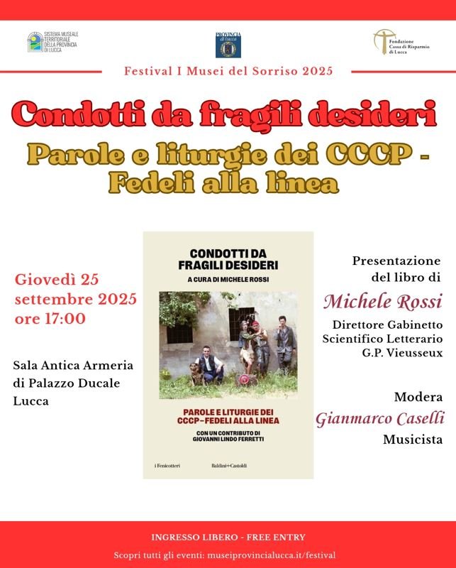 Lucca, 25 settembre 2025 – “Parole e liturgie dei CCCP - Fedeli alla linea”. È Michele Rossi, direttore del Gabinetto Scientifico Letterario G.P. Vieusseux, a presentare il suo libro uscito per Baldini e Castoldi collana I Fenicotteri, giovedì 25 settembre 2025 alle 17 a Palazzo Ducale di Lucca (sala Antica armeria).