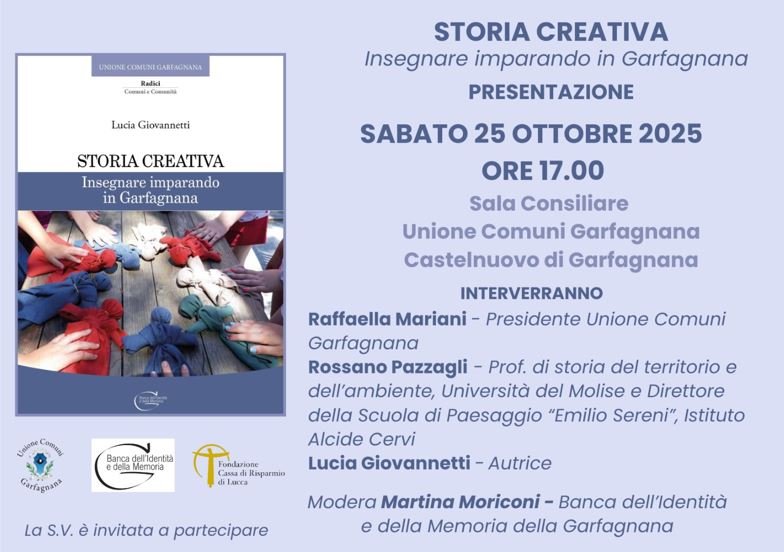 Sabato 25 ottobre alle ore 17, presso la sede dell’Unione Comuni Garfagnana, verrà presentato il volume “Storia Creativa. Insegnare imparando in Garfagnana” scritto da Lucia Giovannetti e pubblicato nella sezione “Radici” della collana editoriale dell’Ente Banca dell’Identità e della Memoria della Garfagnana.