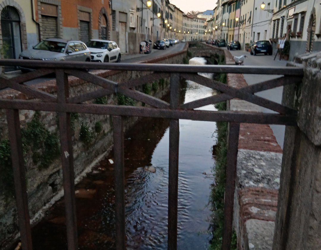 Lucca. Pulire il pubblico condotto lucchese in via del Fosso centro storico di Lucca, c'è di tutto perfino un cartello stradale, con l'acqua bassa si vede di tutto.
