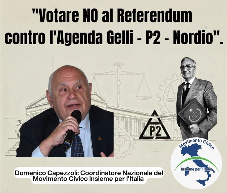 Domenico Capezzoli, Coordinatore Nazionale del Movimento Civico Insieme per l'Italia, lancia un appello urgente al Voto NO al prossimo Referendum Costituzionale sulla Giustizia. L'allarme è sulla sostanza politica: la riforma rischia di replicare aspetti centrali del "Piano di Rinascita Democratica" della loggia P2 di Licio Gelli, il cui obiettivo era la sottomissione del potere giudiziario all'Esecutivo.