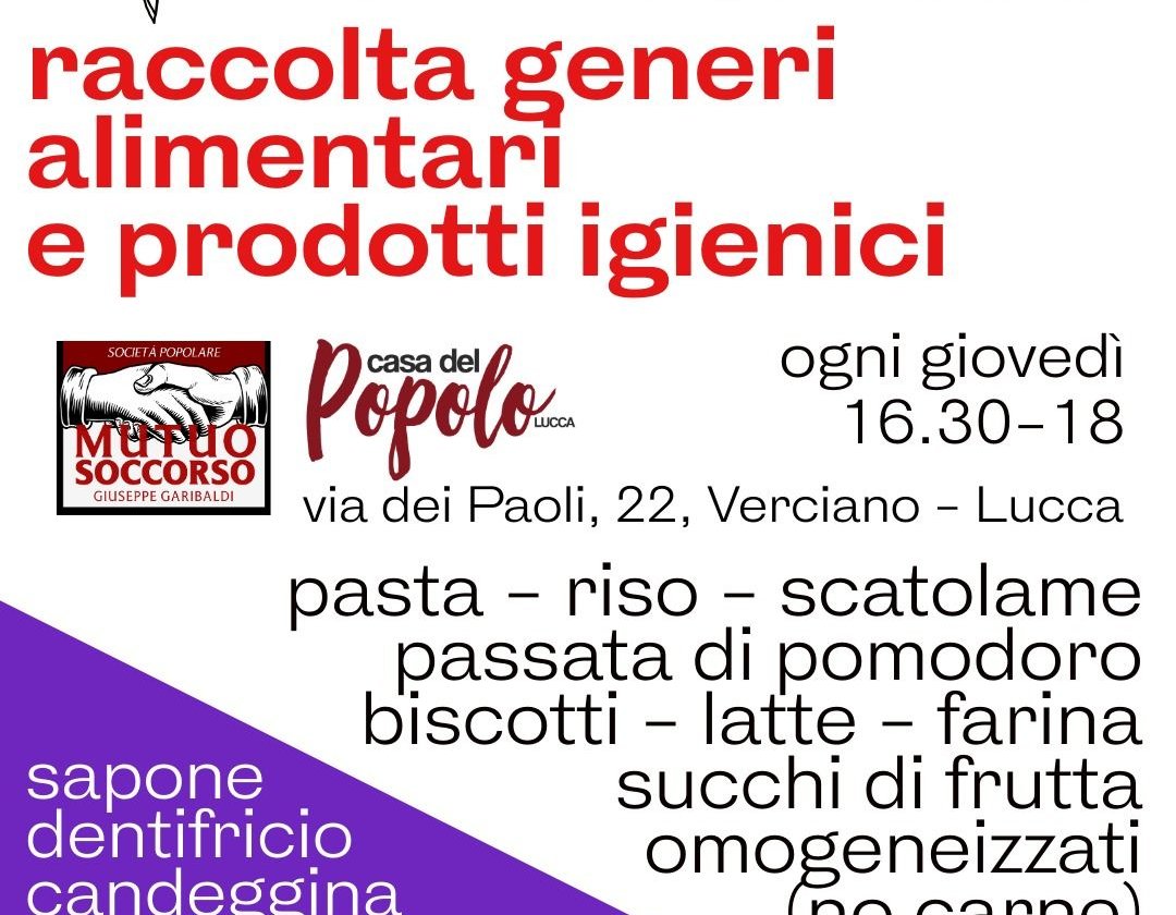 Per alimentare questo circuito virtuoso e solidale, oltre ai mercatini che quasi tutti i fine settimana ci vedono presenti sul territorio, chiediamo un altro aiuto concreto: rilanciamo la raccolta dei prodotti indicati ogni giovedì alla Casa del Popolo dalle 16.30 alle 18.