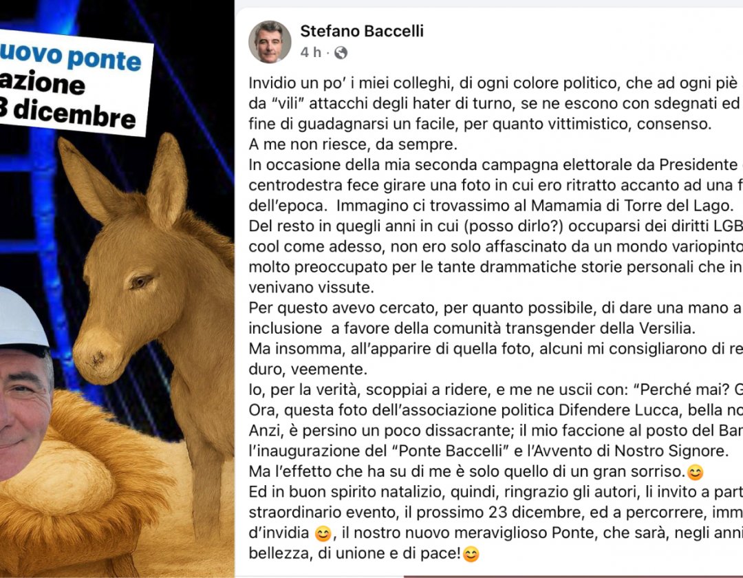 Stefano Baccelli non si offende, anzi sì. Il meme di Difendere Lucca che lo ritrae ‘Bambin Gesù’, in riferimento alla nascita del nuovo ponte sul Serchio che verrà inaugurato per la seconda volta il 23 dicembre, colpisce nel segno.