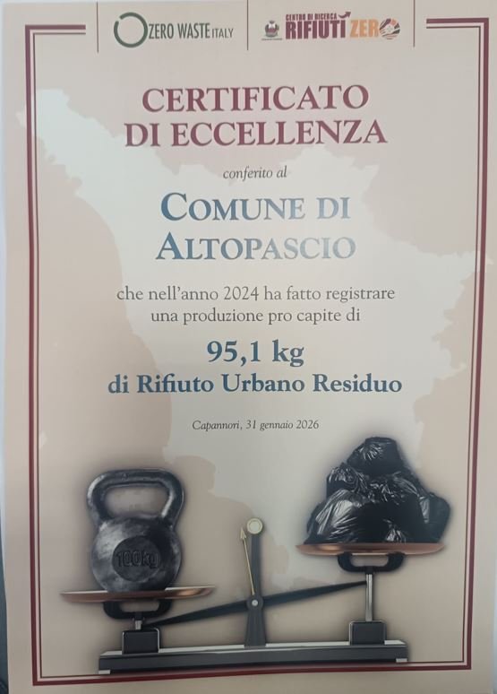 Altopascio, 7 febbraio 2026 - Il Comune di Altopascio ha ricevuto il Certificato di eccellenza per i risultati ottenuti nella riduzione del rifiuto urbano residuo (Rur - non riciclabile), un riconoscimento assegnato nell’ambito del monitoraggio annuale promosso da Zero Waste Italy e dal Centro di ricerca rifiuti zero, che analizzano e certificano le performance ambientali dei Comuni italiani sulla base di dati ufficiali e indicatori oggettivi legati alla produzione dei rifiuti.