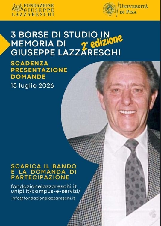 Il bando completo, con il fac-simile della domanda, è reperibile da oggi sul sito della Fondazione Giuseppe Lazzareschi, www.fondazionelazzareschi.it e sul sito dell’Università di Pisa al link https://www.unipi.it/campus-e-servizi/opportunita-e-tempo-libero/premi-e-borse-di-studio/