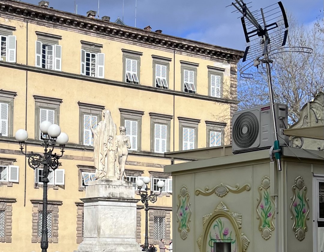Anche la giostra con una bella antenna è aria condizionata in bella vista ! Come mia a Firenze in piazza della repubblica so no ben più attenti mentre a Lucca tutto è permesso o c’è se ne frega altamente !