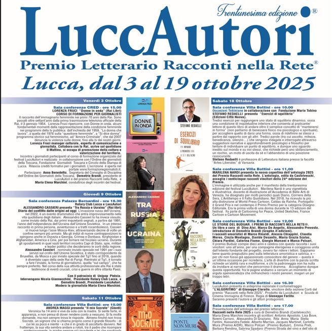Tutti gli incontri in programma sono ad ingresso libero e le giornate conclusive saranno trasmesse in diretta streaming sulla pagina you tube di Racconti nella Rete. Con Lorenza Fruci parleremo dell’evoluzione della condizione femminile attraverso i programmi della Rai. Ricorderemo lo scrittore Andrea Camilleri nel centenario della nascita con l’intervento della nipote Arianna Mortelliti. A Barga con la Fondazione Giovanni Pascoli ci sarà l’incontro tra la poetica di Pascoli e quella di Pasolini con l’intervento di Flavia Leonarduzzi ed Edoardo De Angelis. Si parlerà di Russia e Ucraina nella sede del Rotary Lucca con il giornalista Rai Alessandro Cassieri . Parleremo di Papa Francesco con Stefano Ziantoni e Mons. Filippo Di Giacomo. Con Ilenia Petracalvina della giovane Sarah e del delitto di Avetrana tra verità e bugie. Nell’ambito delle Occasioni Tobiniane della Fondazione Tobino ospiteremo Stefano Redaelli con i suoi “Esercizi di squilibrio”, il disegnatore David Bigotti (Bigo) e l’illustratrice Marilena Nardi.