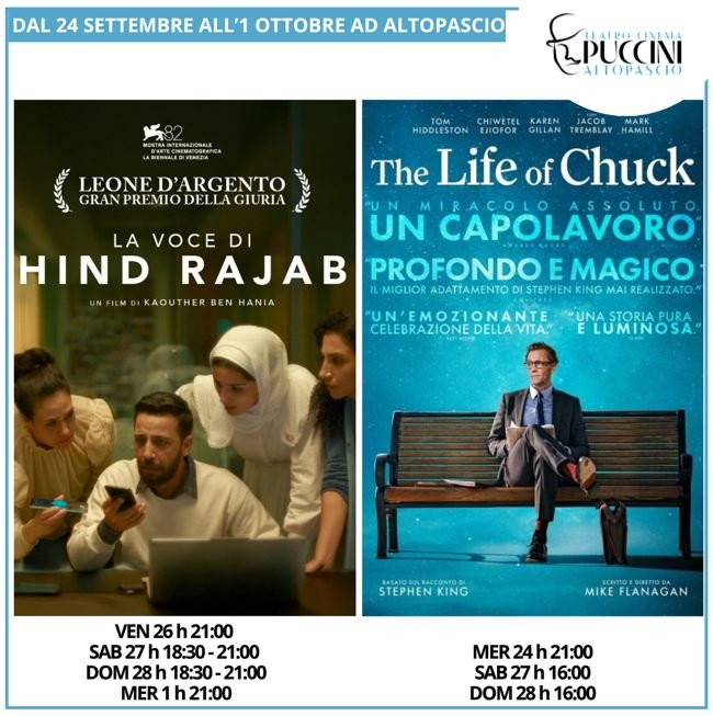La programmazione del cinema al Teatro Puccini di Altopascio  (via Regina Margherita 17), dal 26 settembre all'1 ottobre.
