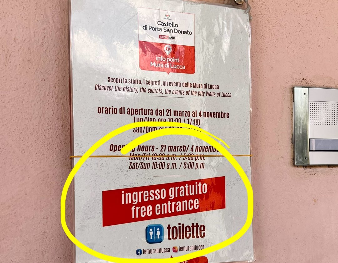 Finalmente è ricomparso il cartello alla casetta San Donato che indica la presenza di bagni con l’ingresso gratuito. Sarebbe cosa buona che anche le altre casermette lo facessero e che ci sia un’adeguata segnaletica sulle mura con il ripristino di quella esistente, come quella che c’era alla salita di San Paolino e che è scomparsa. Lucca Comics & Games 2025: ...