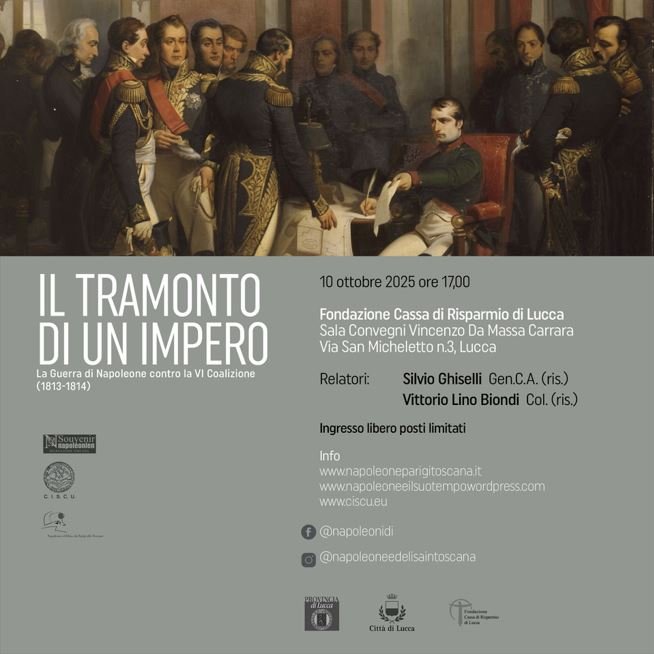 Napoleone contro la VI Coalizione. Appuntamento venerdì 10 ottobre 2025 alle 17 nel Complesso di San Micheletto (sala Vincenzo Da Massa Carrara) a Lucca con il Gen.C.A. (ris.) Silvio Ghiselli e il Col. (ris.) Vittorio Lino Biondi dal titolo “Il Tramonto di un Impero. La Guerra di Napoleone contro la VI Coalizione (1813-1814).”