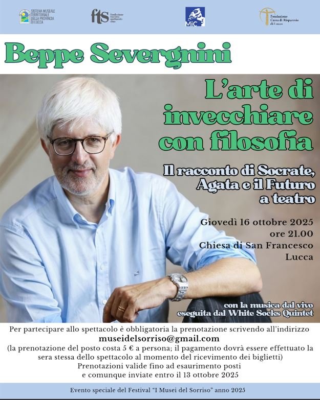 Lucca, 9 ottobre 2025 – Ancora posti disponibili per lo spettacolo “L'arte di invecchiare con filosofia. Il racconto di Socrate, Agata e il Futuro a teatro” di e con Beppe Severgnini con la musica dal vivo eseguita dal White Socks Quintet. Va in scena giovedì 16 ottobre 2025 alle 21 nella chiesa di San Francesco a Lucca lo spettacolo organizzato dal Sistema Museale Territoriale della Provincia di Lucca in collaborazione con Fondazione Toscana Spettacolo Onlus e con il sostegno della Fondazione Cassa di Risparmio di Lucca.