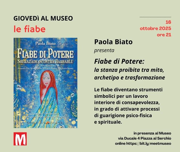 Una lettura simbolica e originale delle fiabe è quella proposta il 16 ottobre alle ore 21.00 per i Giovedì al Museo da Paola Biato, ospite della serata con l’evento dal titolo Fiabe di Potere: la stanza proibita tra mito, archetipo e trasformazione. È possibile assistere all’incontro sia in presenza, presso la sede del Museo, in Via Ducale 4 a San Michele, che online, prenotandosi al link: https://bit.ly/ottobre25.