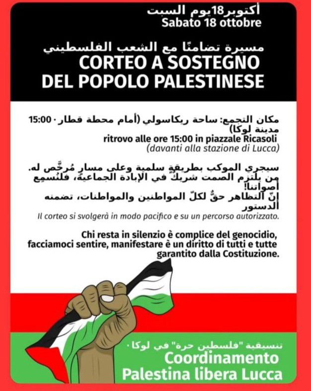 La pressione dal basso non si deve fermare, queste condizioni non garantiscono pace, né ridanno libertà, sicurezza o un tetto sulla testa ai e alle palestinesi. Non può esserci pace in un mondo che continua ad essere ingiusto! Non rimaniamo in silenzio – conclude Palestina Libera Lucca -, facciamoci sentire, chi tace è complice!
