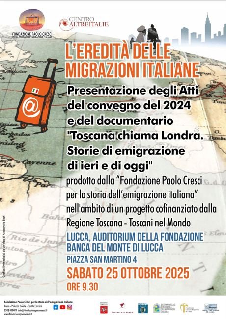 Sabato 25 ottobre 2025 alle 9,30 nell’auditorium Fondazione BML a Lucca, presentazione del n. 70 della rivista “Altreitalie” riportante gli atti del convegno “L’eredità delle migrazioni italiane” e del documentario “Toscana chiama Londra. Storie di emigrazione di ieri e di oggi”.