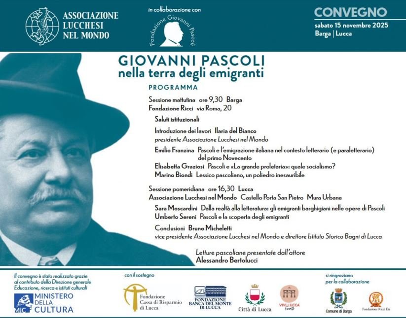 Lucca, 10 novembre 2025 - “Giovanni Pascoli nella terra degli emigranti”: nel 170esimo anniversario della nascita di Giovanni Pascoli, l’associazione Lucchesi nel Mondo dedica al poeta una Giornata di Studi sabato 15 novembre 2025, tra Barga e Lucca.