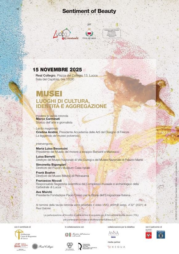 Sentiment of Beauty ODV in occasione di Lucca Orientando 2025 organizza due momenti di dialogo e di confronto nella modalità di tavola rotonda dedicati all’arte e alla sua conoscenza, incentrati sulla comunicazione e comprensione dell’arte il primo giorno, il secondo sui musei come espressione del territorio e della sua storia. In aderenza ai propri obiettivi e finalità associative, in sintonia con i propositi di Lucca Orientando, la volontà dell’associazione lucchese è di fare conoscere agli studenti delle scuole secondarie di secondo grado, ai loro professori e alle famiglie le molteplici declinazioni e offerte di percorsi formativi e possibilità di sviluppo professionale nel mondo dell’arte, dando loro la possibilità di confrontarsi non solo con le Istituzioni ma anche con professionisti affermati e importanti realtà museali del territorio.