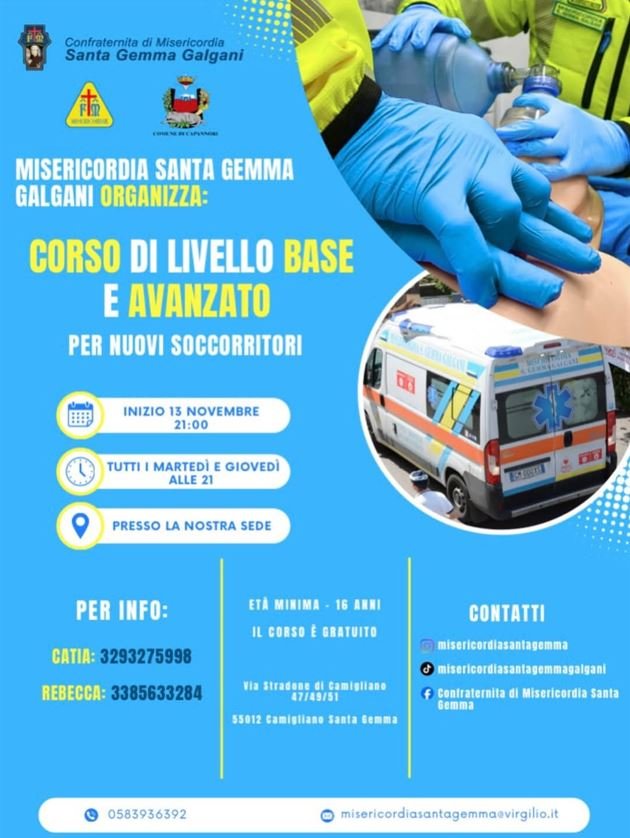 La Confraternita di Misericordia Santa Gemma Galgani organizza, a partire dal 13/11/2025, il corso per soccorritori di livello base ed avanzato.