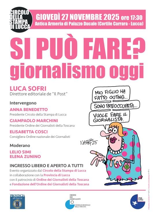 Lucca, 14 novembre 2025 – Giornalismo oggi. Si può fare? La mobilitazione nazionale dei giornalisti indetta dalla FNSI insieme con la Consulta delle Associazioni regionali di Stampa per la giornata del 28 novembre anticipa l’incontro a Lucca con Luca Sofri a giovedì 27 novembre 2025, sempre alle 17,30 nell’antica Armeria di Palazzo Ducale.