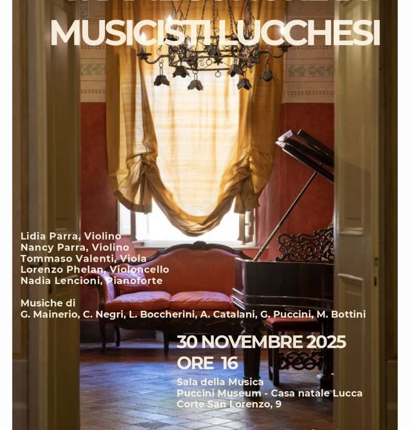 Lucca, 25 novembre 2025 – Prenotazioni aperte per “Trame sonore di musicisti lucchesi”. L’appuntamento con il Quartetto Lilium e Nadia Lencioni per ascoltare le musiche di Marianan Bottini, Luigi Boccherini, Alfredo Catalani, Giacomo Puccini, Giorgio Mainerio, Cesare Negri è nella Sala della Musica del Puccini Museum – Casa Natale a Lucca (corte San Lorenzo, 9), dove domenica 30 novembre 2025 alle 16 si esibiranno gli interpreti Lidia Parra e Nancy Parra al violino, Tommaso Valenti alla viola, Lorenzo Phelan al violoncello, Nadia Lencioni al pianoforte.