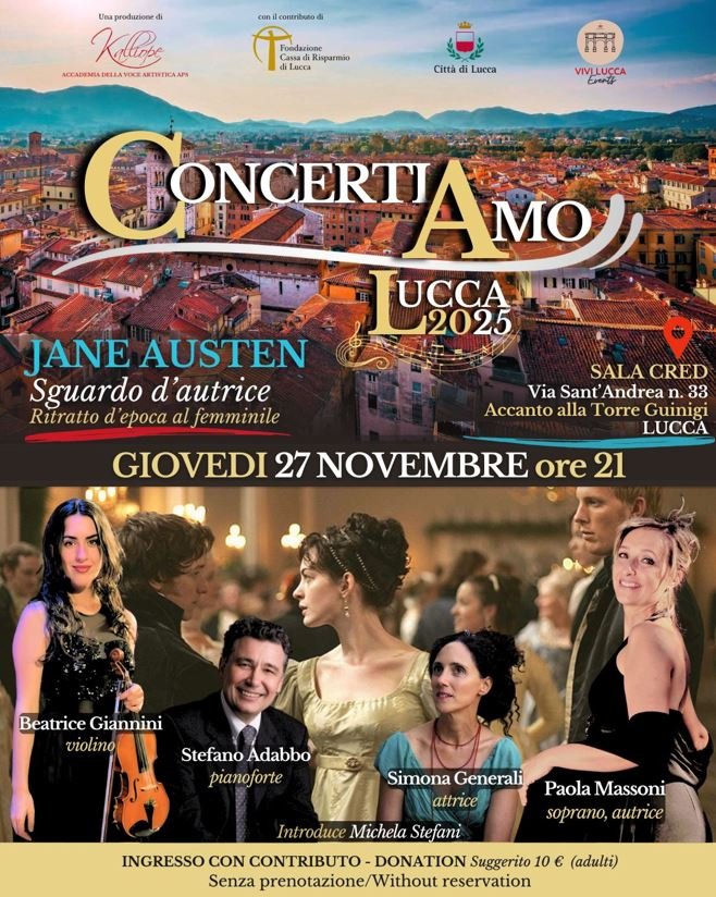 Dopo questa soddisfazione, il soprano e autrice Paola Massoni e l’attrice Simona Generali tornano insieme in scena Giovedì 27 novembre alle ore 21 sempre nella Sala Teatro CRED, in Via Sant’Andrea n. 33, nel centro storico di Lucca, con lo spettacolo JANE AUSTEN, ‘Sguardo d’autrice. Ritratto di un’epoca al femminile’. Nel 250° anniversario della sua nascita, racconteranno tra parola e musica la vita della scrittrice inglese, le sue opere, l’atmosfera di Londra nell’epoca romantica, tra passeggiate, feste e innamoramenti con citazioni dai suoi celeberrimi romanzi e l’ascolto di brani attinti dall’archivio della famiglia Austen interpretati al violino da Beatrice Giannini e al pianoforte da Stefano Adabbo, pianoforte; l’evento sarà introdotto dalla ricercatrice prof.ssa Michela Stefani e un finale a sorpresa, a cura della Società di Danza di Lucca, chiuderà questa originale e partecipata edizione 2025 del Festival ConcertiAmoLucca tra Musica e Letteratura.
