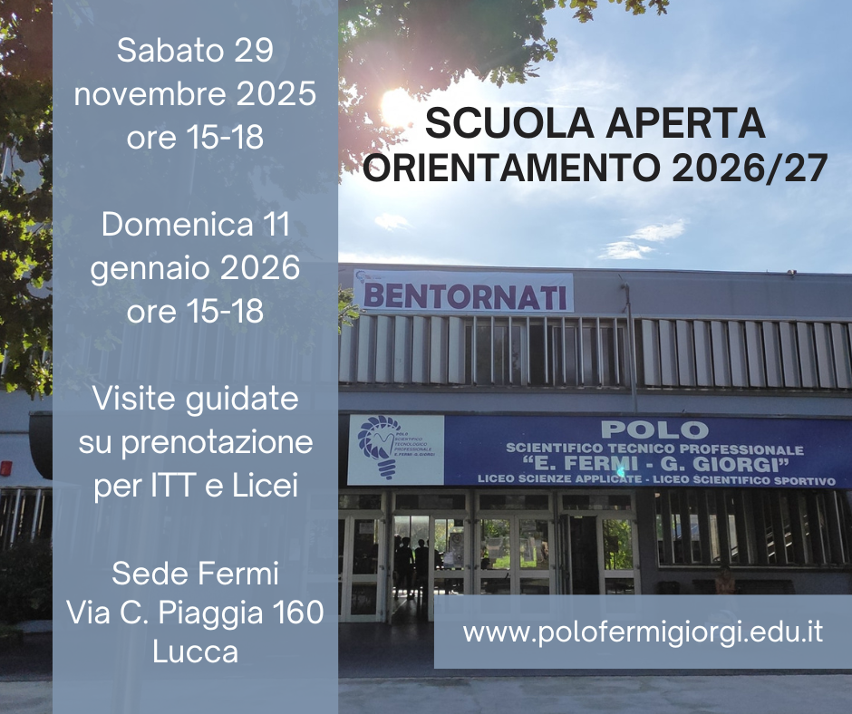 Il Polo scientifico tecnico e professionale E. Fermi – G. Giorgi, realtà scolastica di rilevanza regionale, si prepara a incontrare studenti e famiglie per presentare la propria offerta formativa, in una serie di iniziative in programma da novembre 2025 fino a gennaio 2026. Prossima tappa di questo percorso sarà la partecipazione al Salone dell’Orientamento, in programma sabato 29 novembre, la mattina, presso la scuola Jenco di Viareggio, a cui il Polo Fermi Giorgi sarà presente con uno stand informativo.