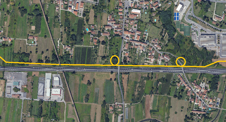 1. Dal casello Lucca Est all'intersezione per il Polo Fiere. Vanno demoliti alcuni edifici in via della Formica. La rotonda serve per avere il collegamento diretto con il ponte che va al Polo Fieristico