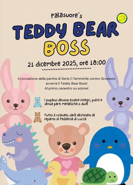 debutta un’iniziativa speciale: il Teddy Bear Toss, un momento di solidarietà che per la prima volta nella nostra realtà, porterà peluche e sorrisi ai bambini del reparto di Pediatria di Lucca. Al primo canestro su azione, il parquet si riempirà dei pupazzi lanciati dal pubblico: tutti i peluche raccolti saranno donati alla Pediatria, insieme all’offerta libera che ognuno potrà lasciare per sostenere i piccoli pazienti.