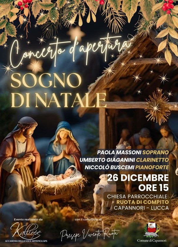 Il 26 dicembre alle ore 15, giorno di S. Stefano, dopo le soddisfazioni ottenute con l’originale e partecipato Festival ConcertiAmoLucca, Paola Massoni torna ad allietare con la sua duttile voce la Chiesa del Presepe Vivente di Ruota di Compito (Capannori, Lucca), con un Concerto pieno di magia, che aprirà ufficialmente l’intera manifestazione realizzata con il contributo del Comune di Capannori.