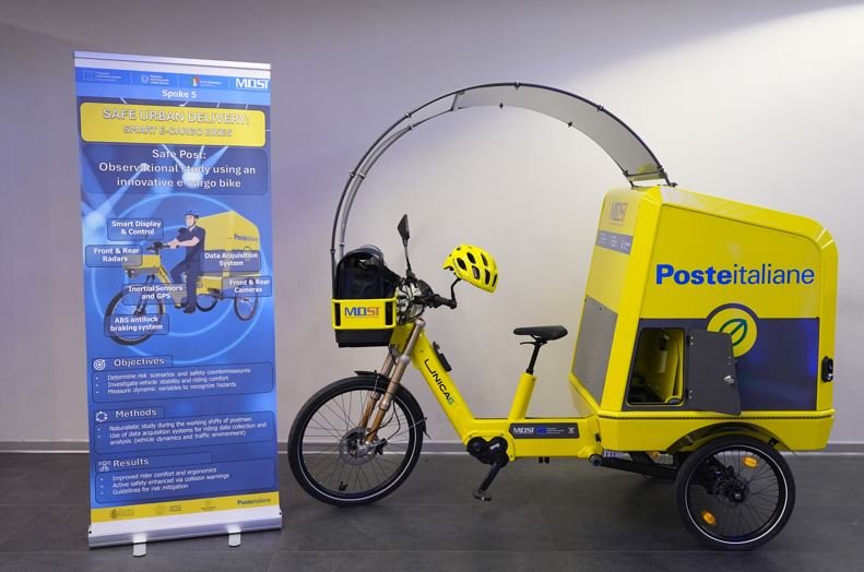 Il prototipo è caratterizzato da una capacità di carico superiore rispetto alle biciclette tradizionali, grazie a un vano modulare capiente fino a 700 litri, per un massimo di 100 chilogrammi. La configurazione a tre ruote, inoltre, offre maggiore stabilità durante la guida e consente di operare in modo sicuro anche in aree con traffico intenso o con pavimentazioni irregolari. La velocità massima è limitata a 25 chilometri orari come previsto dalla normativa per i veicoli leggeri a pedalata assistita. La rete di sensori, radar e calcolatori elettronici integrati sul veicolo, offre innovativi servizi di supporto al conducente; e permette di fornire dati utili alla ricerca di soluzioni sempre più efficaci per incrementare la sicurezza. Questi dispositivi consentono di rilevare ostacoli lungo il percorso, monitorare lo stato e l’usura degli pneumatici, fornire al conducente supporto per migliorare lo stile di guida contribuendo alla prevenzione degli incidenti e all’efficienza delle operazioni.