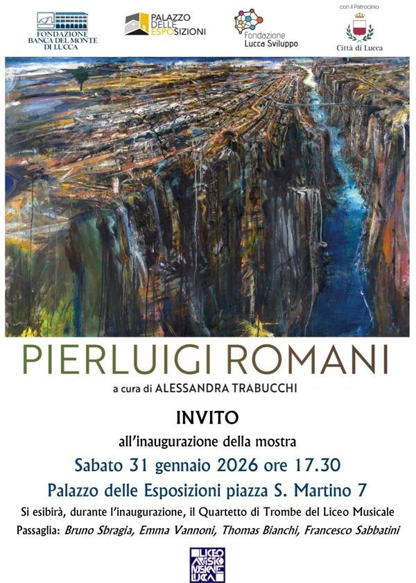 La prima esposizione del Calendario 2026 è la personale di Pierluigi Romani, classe 1936, che apre sabato 31 gennaio 2026 alle 17.30, con l’esibizione del quartetto di trombe del Liceo Musicale A. Passaglia, composto da Bruno Sbragia, Emma Vannoni, Thomas Bianchi, Francesco Sabbatini, che offriranno, alla presenza del prof. Romani, un momento musicale di introduzione alla mostra.
