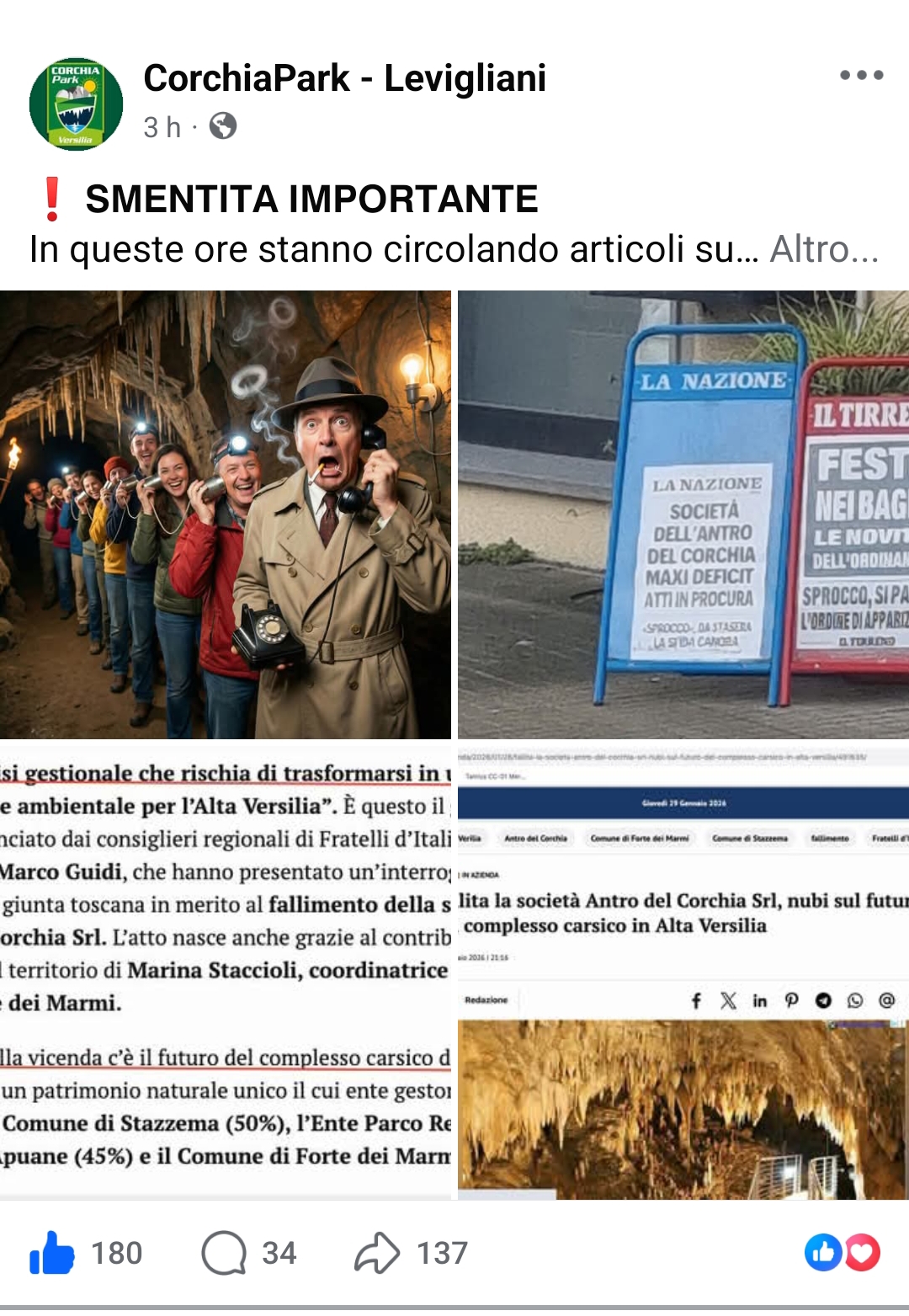 La società Antro del Corchia Srl, nonostante la denominazione possa indurre in equivoco, non ha alcun ruolo né alcun coinvolgimento nella gestione della grotta turistica dell’Antro del Corchia. Si tratta di una società che in passato ha avuto in carico la gestione del sito esclusivamente nell’ambito di un comodato d’uso gratuito, sottoscritto nel 1996 tra il Parco delle Alpi Apuane e la Comunione dei Beni Comuni di Levigliani, finalizzato unicamente a consentire gli interventi di turisticizzazione della grotta e la realizzazione del percorso attrezzato. Tale comodato è scaduto nel 2015 e non è stato rinnovato. A partire da tale data, la società Antro del Corchia Srl ha cessato ogni rapporto con la gestione della grotta, pur continuando a riportarne il nome nella propria ragione sociale. Alla scadenza del comodato, la Comunità di Levigliani ha esercitato l’opzione di riscatto dei beni strumentali, e la società Antro del Corchia Srl è stata conseguentemente liquidata. Da oltre dieci anni, pertanto, né la società Antro del Corchia Srl né gli enti pubblici che ne costituivano il capitale sociale hanno alcun ruolo, diretto o indiretto, nella gestione del sito turistico, che è affidata integralmente, stabilmente e senza interruzioni alla Cooperativa Sviluppo e Futuro Levigliani