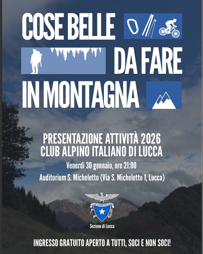Giovedì 30 gennaio 2026, alle ore 21.00, presso il Complesso di San Micheletto a Lucca, si terrà la tradizionale serata di presentazione delle attività della sezione di Lucca del Club Alpino Italiano.