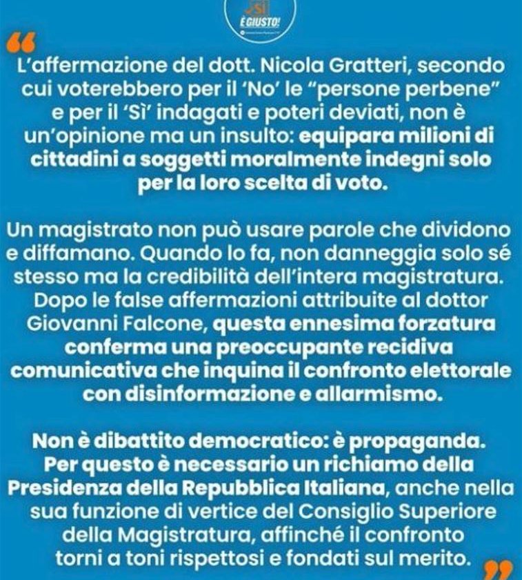 "Il Magistrato Gratteri è il prototipo del fascista di sinistra, politicizzato e antidemocratico, che la Riforma Nordio vuole contenere. Anche per questo votare SI al Referendum è un dovere civico di ogni democratico, che vuole un Italia giusta e partecipata. Auspichiamo che Il Presidente Mattarella intervenga per contenere le idiozie di un Magistrato incapace di essere serio, equilibrato autorevole, come richiede la Costituzione Italiana. Gratteri squalifica ancora una volta, dopo aver falsificato in TV le parole di Giovanni Falcone la tanta Magistratura onesta e laboriosa, che in maniera seria affronta il Referendum votando SI o NO per convincimento personale e non per pregiudizio ideologico."
