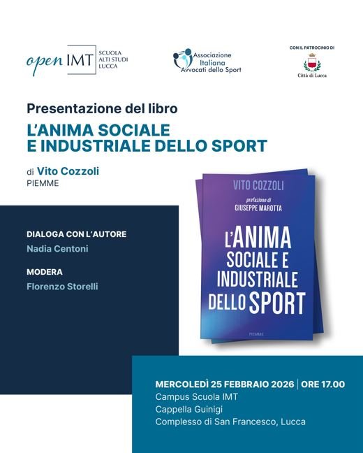 Lucca, 17 febbraio 2026 - Vito Cozzoli con il suo libro “L’anima sociale e industriale dello sport” sarà al centro del terzo appuntamento “Open IMT”, la serie di incontri rivolti al pubblico organizzati dalla Scuola IMT che vede ospiti di alto livello riflettere su temi di attualità e cultura.