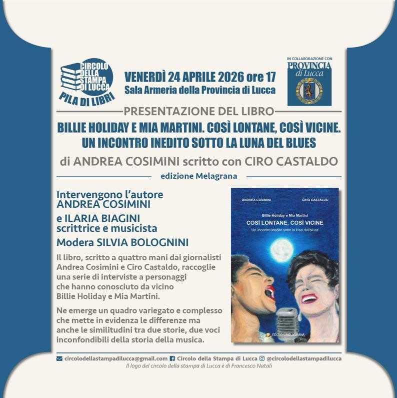 Questo è solo uno dei tanti aspetti che accomunano Lady Day e Mimì trattati nel libro di Andrea Cosimini e Ciro Castaldo che sarà presentato venerdì 24 aprile, alle 17, nell'Antica Armeria di Palazzo Ducale, a Lucca, organizzato dal Circolo della Stampa di Lucca con la Provincia di Lucca e a ingresso libero.