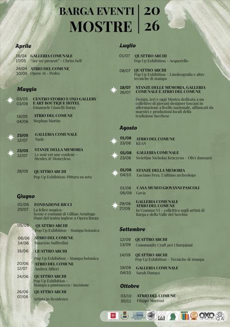 “L’arte - è il commento della Sindaca, Caterina Campani - è uno dei linguaggi più profondi e universali a disposizione delle comunità. Parla del passato e del futuro, costruisce identità, genera dialogo e bellezza condivisa. Con questo calendario riaffermiamo il ruolo di Barga come Castello dell’Arte: un luogo in cui si incontrano talenti emergenti, maestri affermati, tradizioni artigiane e nuove visioni creative. È nostro impegno continuare a sostenere l’arte come veicolo di cultura, socialità, valorizzazione del territorio e richiamo turistico”.