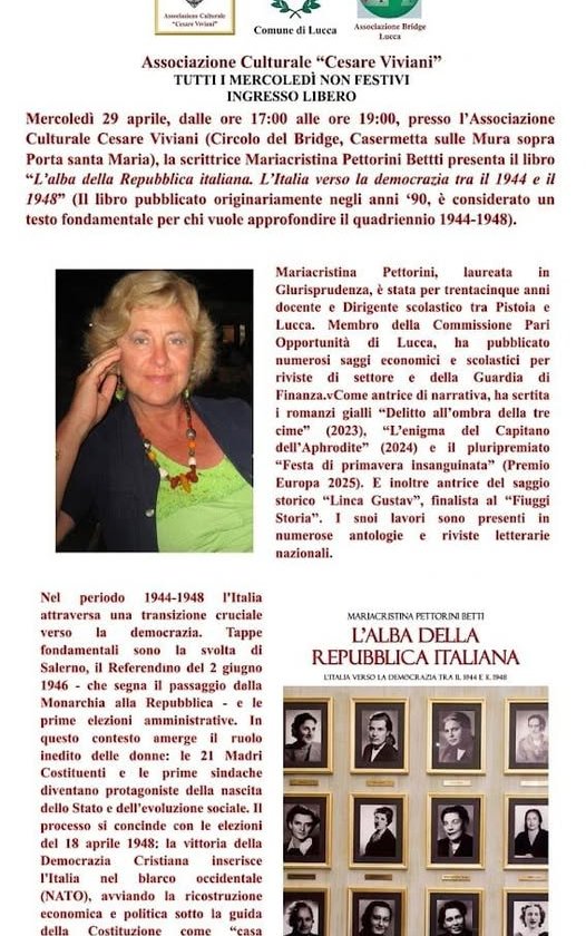 Mercoledì 29 aprile, dalle ore 17:00 alle ore 19:00, presso l’Associazione Culturale Cesare Viviani (Circolo del Bridge, Casermetta sulle Mura sopra Porta Santa Maria), la scrittrice Mariacristina Pettorini Bettti presenta il libro “L’alba della Repubblica italiana. L’Italia verso la democrazia tra il 1944 e il 1948” (Il libro è considerato un testo fondamentale per chi vuole approfondire il quadriennio 1944-1948).